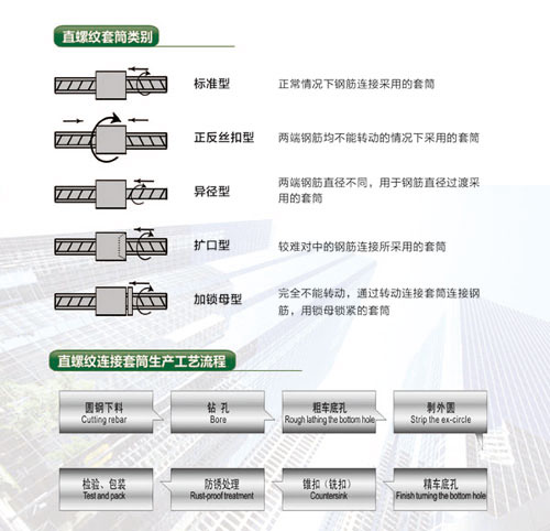 直螺紋連接套筒適用于建筑工程中鋼筋機械連接,主要連接Φ12-Φ50mm的HRB335、HRB400及HRB500普通熱軋帶肋鋼筋。
